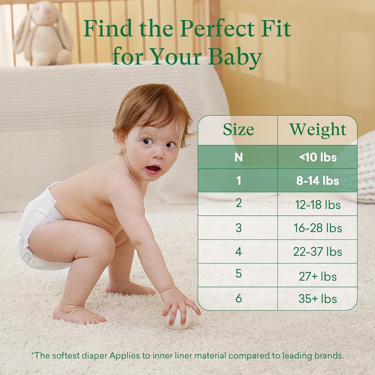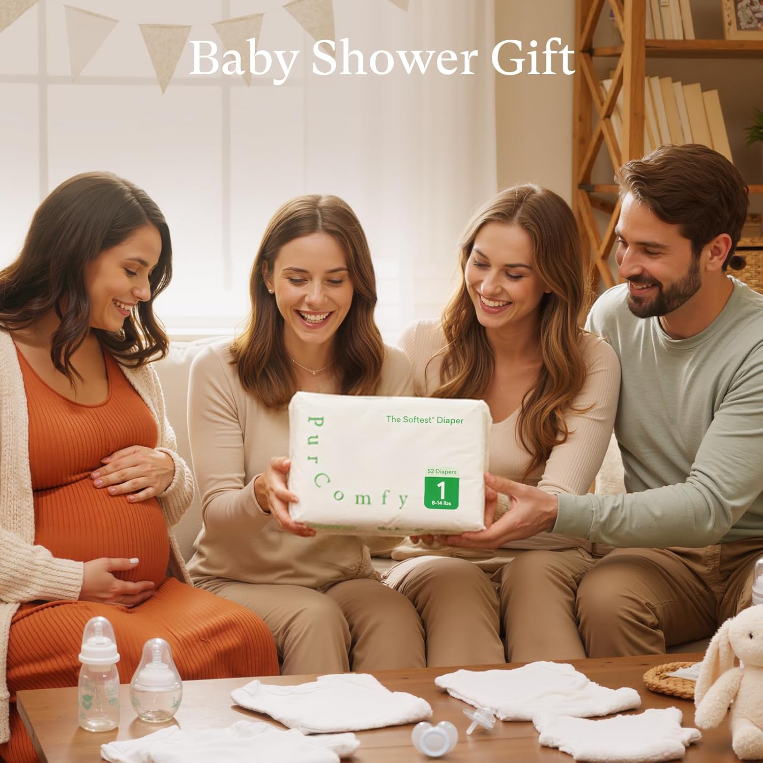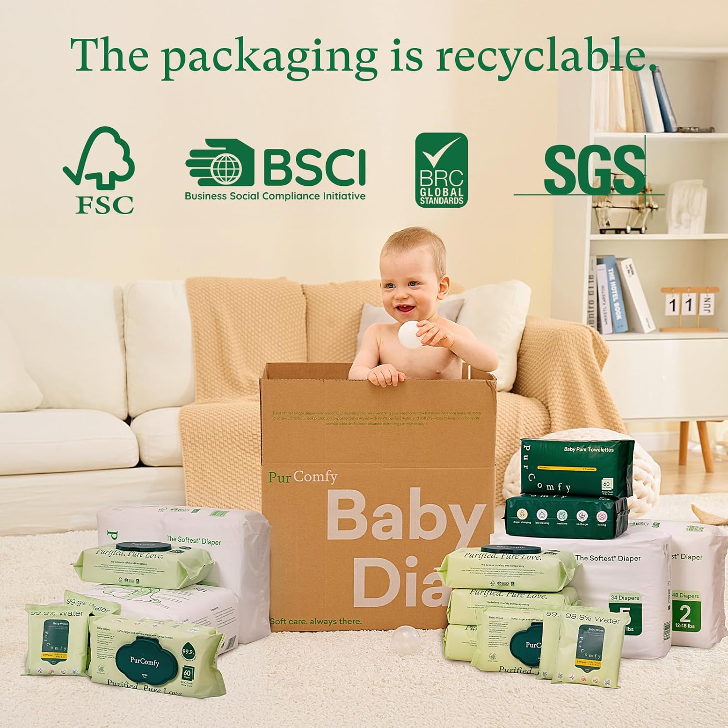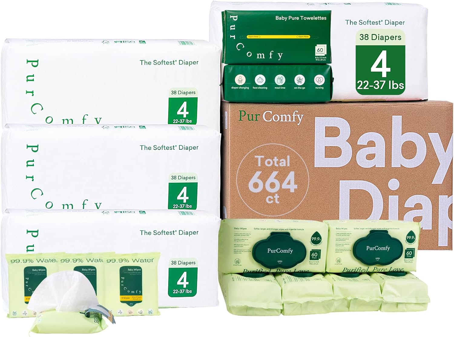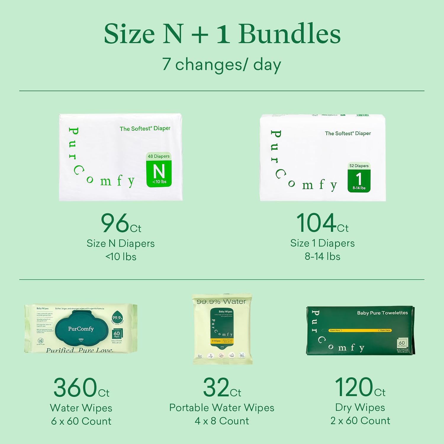 PurComfy Baby Diapers Essential Kit, Size N (96Ct) & Size 1 Diapers (104Ct), 6 Water Wipes (360Ct), 4 Travel Wipes (32Ct) and 2 Dry Wipes(120Ct), Baby Essentials Kit for Sensitive Skin, Total 712 Ct