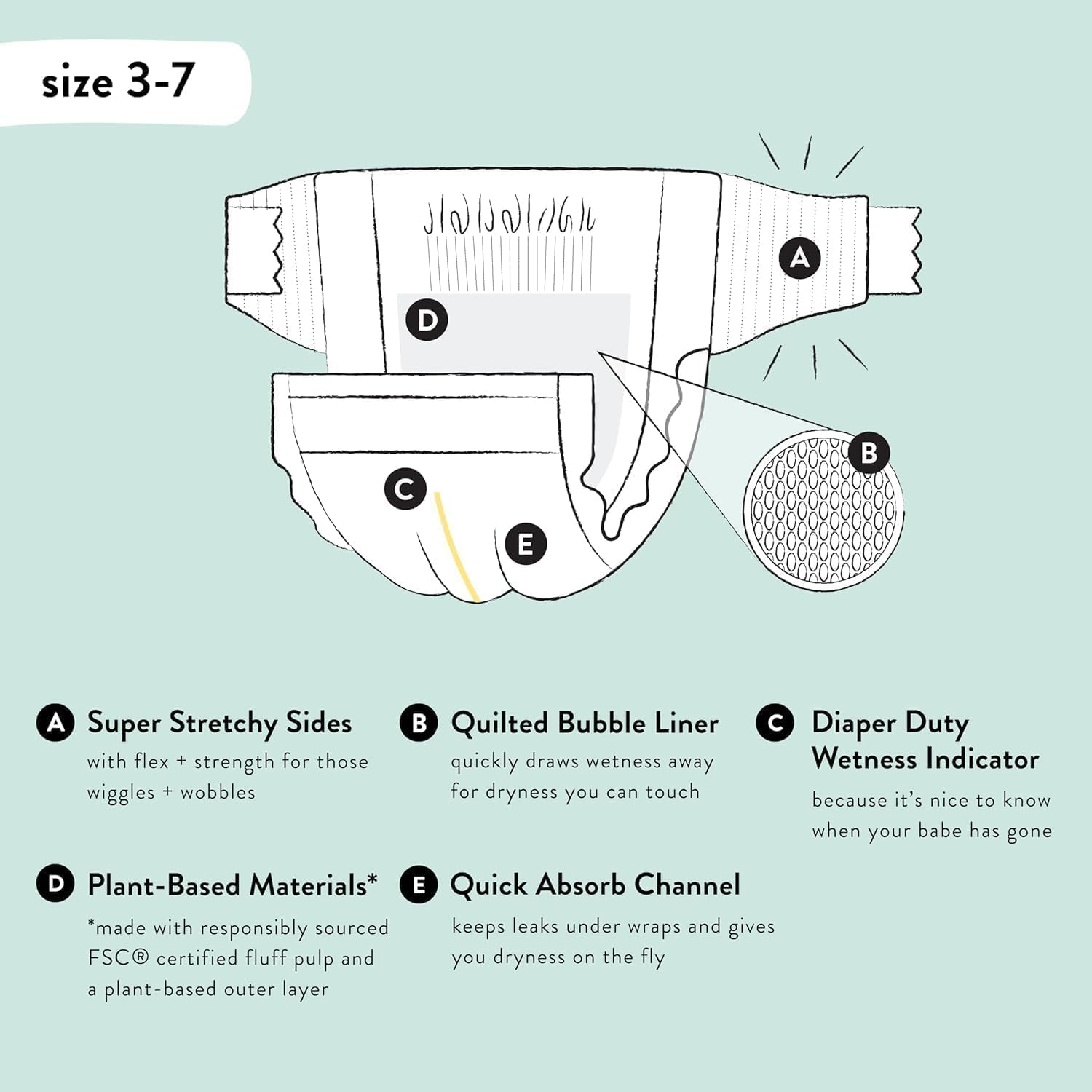 Our diapers are made without 3500+ ingredients, feature a plant-based backsheet, and are dermatologist-tested and toxicologist-evaluated.